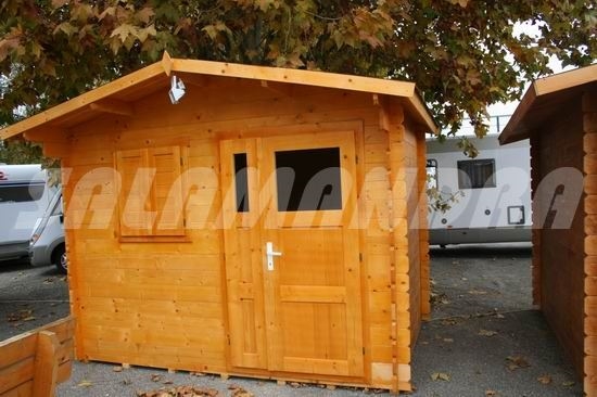 Casetta sistema blockhouse con pavimento, spessore legno cm 2,0 mt 3,00 x mt 2,00 x h 2,30                Informativa sulla produzione di serie - Porta ingresso in legno massiccio - Infisso, interno con predisposizione vetro semplice ( senza vetro) ed esterno con oscuranti. - Tetto in legno (escluso tegole o similare)