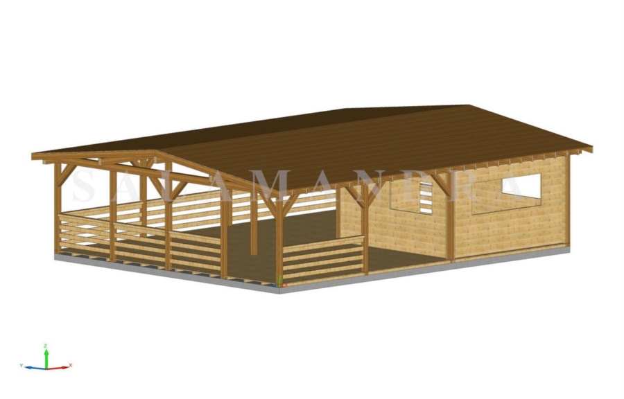 Chiosco con tettoia  di mq 80,00 ( mt 10,00 x mt 8,00 x h 2,90) Conposto da: chiosco di mq 16,00 ( mt 4,00 x mt 4,00) e tettoia di mq 64,00  Descrizione:   Pareti perimetrali di spessore cm 4,2 con travi profilati a doppia frezzatura uniti ad                                incastro verticale.                     - Pareti esterne cm 4,2                     - Con pavimento in legno chiosco e tettoia                     - Ringhiere perimetrali                     - Porta ingresso in legno massello di abete                     - Finestre in legno, interni con predisposizione vetri e con oscuranti esterni.                      - Tetto montato per tutta la sua superfice con tavole di spessore cm 2 ( senza tegole                             o similare)                     - Legno naturale di abete rosso di prima scelta essiccato e non tratato.