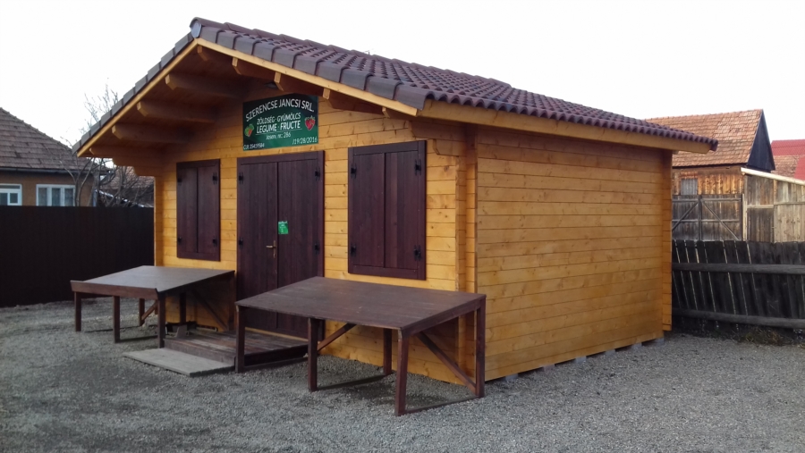 Casetta C14 sistema blockhouse con pavimento e con sporgenza frontale, spessore legno cm 4,2